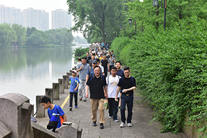 浩浩蕩蕩的正行隊(duì)伍繞公園人工湖一圈后,穿過體育公園,來到上塘河邊,沿著上塘河向南進(jìn)發(fā)。當(dāng)日天氣涼爽,河邊道路又都在植被的庇蔭之下,空氣中彌漫著滿滿的負(fù)氧離子,歡樂正行活動持續(xù)了2小時(shí)左右。